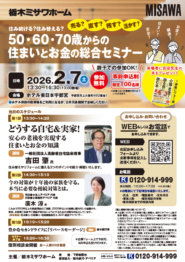 2月7日(土)栃木ミサワホーム様主催の「50・60・70歳からの住まいとお金の総合セミナー」にて弊社代表の廣木涼が講師を務めました。